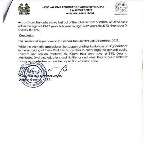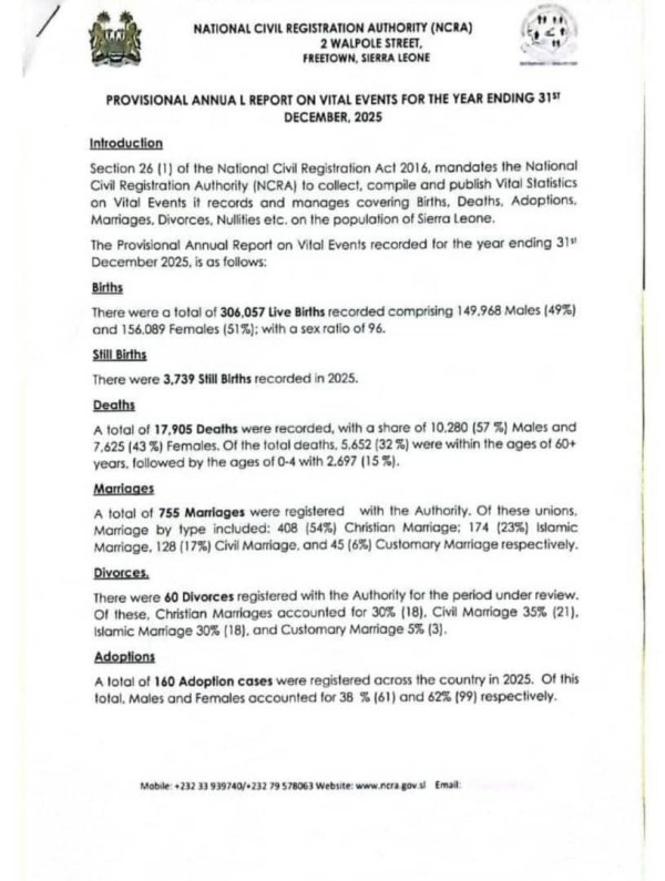 Section 26(1) of the National Civil Registration Act 2016, mandates the National Civil Registration Authority (NCRA) to collect, compile and publish Vital Statistics on Vital Events it records and manages covering Births, Deaths, Adoptions, Marriages. Divorces, Nullifies etc. on the population of Sierra Leone.