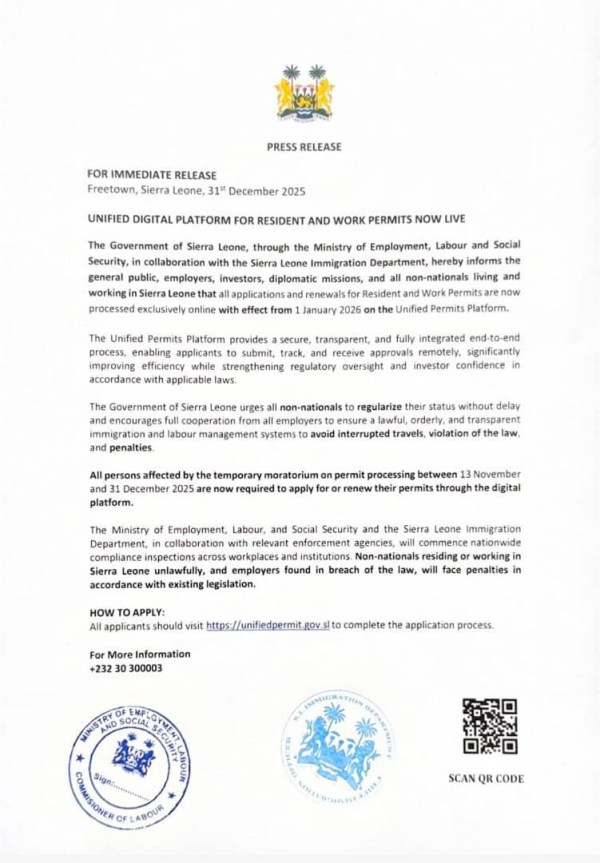 The Government of Sierra Leone, through the Ministry of Employment, Labour and Social Security, in collaboration with the Sierra Leone Immigration Department, hereby informs the general public, employers, investors, diplomatic missions, and all non-nationals living and working in Sierra Leone that all applications and renewals for Resident and Work Permits are now processed exclusively online with effect from 1 January 2026 on the Unified Permits Platform.