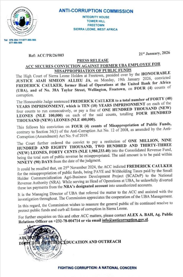 The Criminal, FREDERICK CAULKER, former Head of Operations at the United Bank for Africa (UBA), and of No. 38A Taylor Street, Wellington, Freetown, who stole nearly 2 Billion Old Leones of money meant for the NRA and relocated his family in the United States of America and fled to America to join them has been convicted FOUR (4) counts of corruption. WE WILL NOT ALLOW HIM ENJOY HIS CRIMINALITY EVER HAPPILY AFTER AT ALL! He has now been sentenced to 40 years imprisonment.