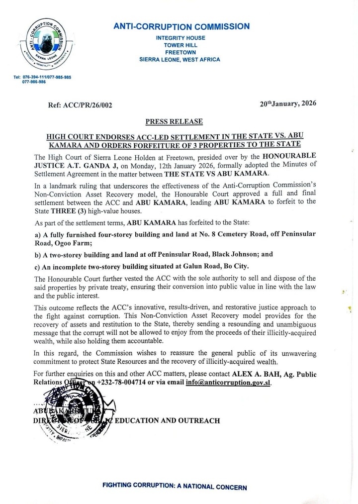 HIGH COURT ENDORSES ACC-LED SETTLEMENT IN THE STATE VS. ABU KAMARA AND ORDERS FORFEITURE OF 3 PROPERTIES TO THE STATE